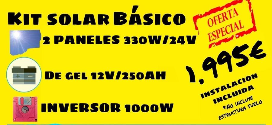 Kit básico de 1000W compuesto de: 1 Inversor de 1KW, 2 paneles solares de 340W con estructura coplanar y fijaciones, y 1 batería de gel de 250Ah, Instalación, mano de obra y material eléctrico necesario.