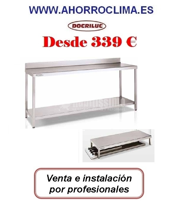 Mesa de trabajo acero inoxidable desmontable docriluc con soportes regulables en altura. Visite nuestra web www. ahorroclima. es. Servicio en toda España. Pídanos presupuesto sin compromiso. Venta e instalación de mesas de trabajo en acero inoxidable desmontables Docriluc. 339 € IVA no incluido. Construidas totalmente en acero inoxidable. Con soportes-patas regulables. Una vez desmontadas tan sólo tienen 36 cm en altura. La instalación es a cargo de empresas instaladoras autorizadas garantizándole 1 año de garantía del fabricante y servicio técnico. Características técnicas: Mesas construidas totalmente en acero inoxidable 18/10, en acabado satinado con refuerzos metálicos.